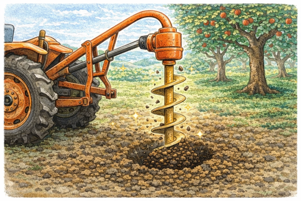一見すると固そうに見える果樹園の土にも物理性は重要です。果樹園ではホールディガーなどの機械を使い、幹から離れた根の少ない位置に垂直に大きな穴を空け、通気性や排水性の改善を図ることがあります。そこまでしてでも、やるべき課題である物理性。物理性は目に見えにくく、何とかなるだろうと、後回しにしてしまいがち(私自身がそうなのです)なのですが、非常に重要な土壌の性質なのです。