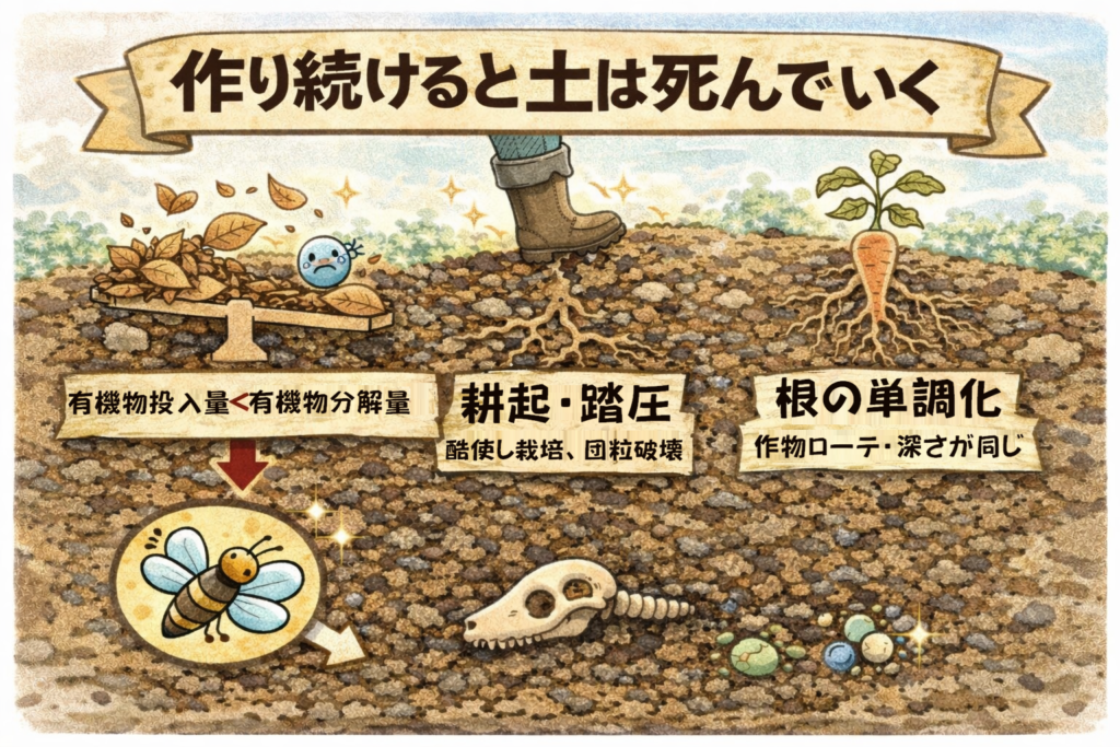- 有機物投入量<有機物分解量=有機物が枯渇してしまう