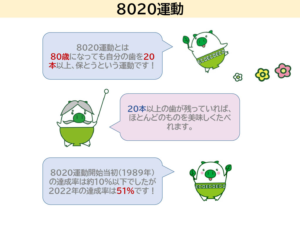 「80歳になっても、自分の歯を20本保ちましょう」という取り組みです。歯が20本以上残っていれば、ほとんどの食品を噛んで味わうことができるとされています。ちなみに、親知らずをいれると、32本、親知らずを除くと、28本というのが、大人の歯の数になります。