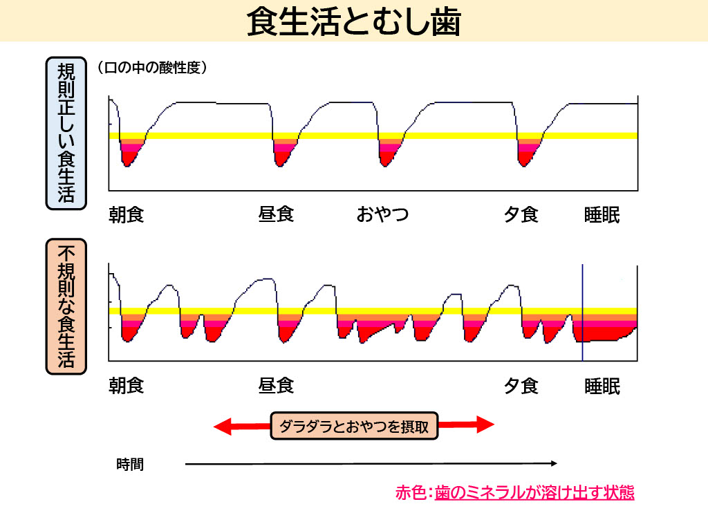特に、「だらだらと続く間食」は、虫歯のリスクを高めます。飲み物も含めた摂取の頻度には、注意が必要です。