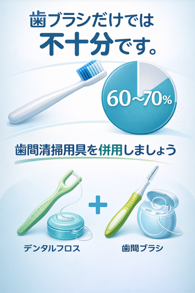 歯ブラシによるプラーク除去率は60~70%程度とされています。歯周病は歯と歯の間から進行することが多いため、